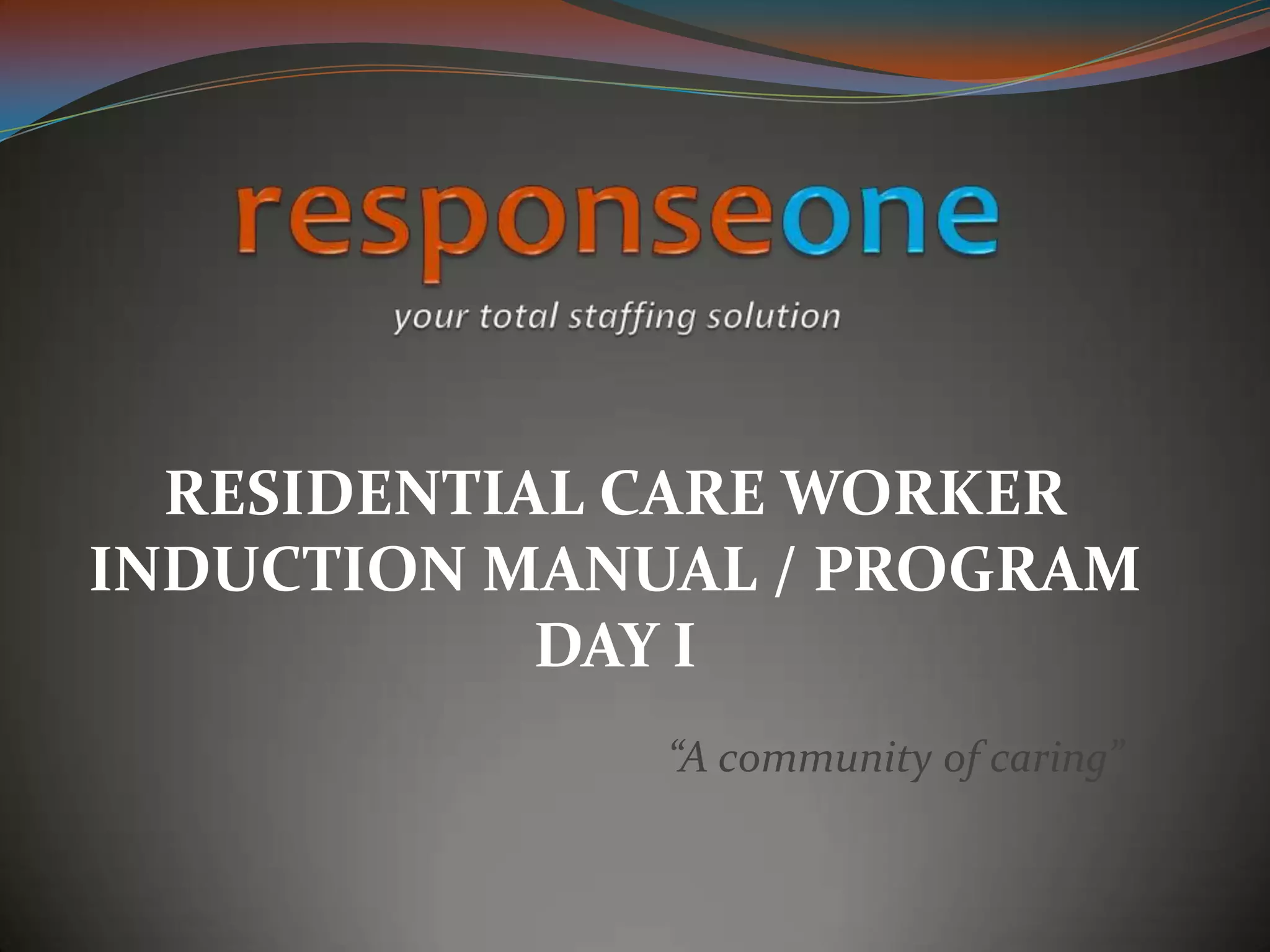The document provides an induction manual for residential care workers. It outlines the mission of Response One to provide quality services. It discusses the roles and responsibilities of disability support workers, including providing advocacy, implementing behavior plans, and ensuring quality care. It emphasizes maintaining confidentiality, understanding different types of care needs, and following procedures. The document also covers prejudice in the workplace, legal responsibilities, and the importance of duty of care.