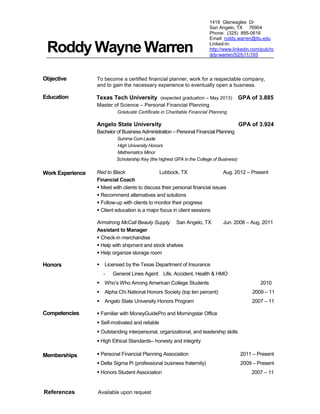 Roddy Warren is seeking a position as a certified financial planner. He has a Master's degree in Personal Financial Planning from Texas Tech University and expects to graduate in May 2013. He has worked as a financial coach at Red to Black since August 2012, where he meets with clients to discuss financial issues and recommend solutions. Warren has also been licensed by the Texas Department of Insurance since 2010.