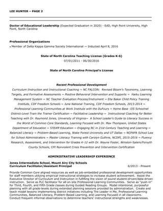 Lee Hunter is an experienced educator administrator, curriculum facilitator, and instructional coach dedicated to maximizing the potential of every student. They have over 20 years of experience in various leadership roles developing curriculum, facilitating professional learning communities, presenting at conferences, and directing summer reading programs. They are currently a curriculum facilitator and assistant principal at Jones Intermediate School, where they provide professional development, analyze student data, and mentor teachers.