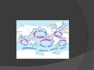 This document discusses ocean circulation patterns driven by temperature and salinity differences. It explains that surface waters are well-mixed to 100m depth, below which density changes rapidly due to temperature decreases. Latitude also affects density, with warmer, lower salinity water at the equator being less dense than cooler, higher salinity water at 30 and 60 degrees latitude. Thermohaline circulation refers to global-scale density-driven vertical circulation controlled by temperature and salinity. Gyres are large circular ocean currents driven by winds and the Coriolis effect. Different ocean basins have varying circulation patterns influenced by factors like incoming rivers and surrounding land masses.