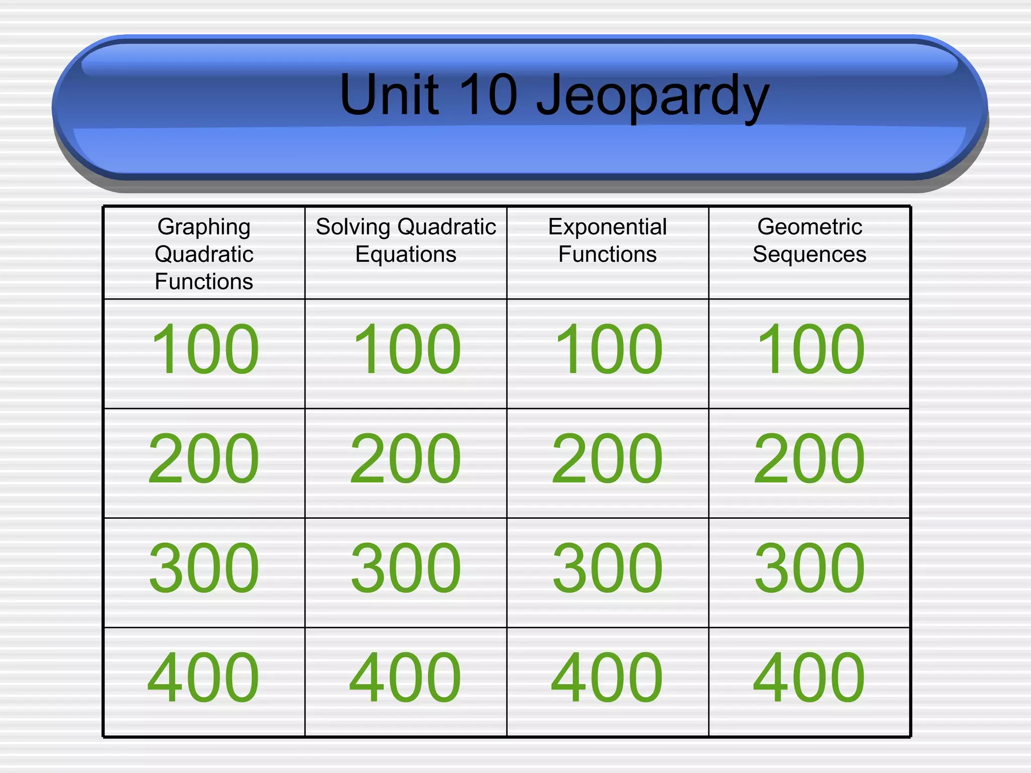 The document contains a series of multiple choice questions about geometric sequences, exponential functions, solving quadratic equations, and graphing quadratic functions. The questions cover topics like finding the equation that corresponds to a graph, finding the coordinates of the vertex of a quadratic equation, solving quadratic equations by taking the square root of each side, comparing the slopes of linear functions, finding the y-intercept of a function, evaluating a function given an x-value, identifying the next term in a geometric sequence, finding the geometric mean of a sequence, and finding the axis of symmetry and solutions of a quadratic equation.