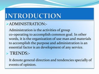 This document discusses trends and issues in nursing administration, education, and practice. It outlines changes taking place in society, other professions like medicine, and within nursing itself. Key trends include pursuing higher nursing degrees, changes in working conditions and pay, and adoption of technologies like computers and mobile devices. Issues relate to nursing registration, diploma vs. degree qualifications, specialization, standards of care, and challenges in nursing education like inadequate facilities and shortage of teachers.