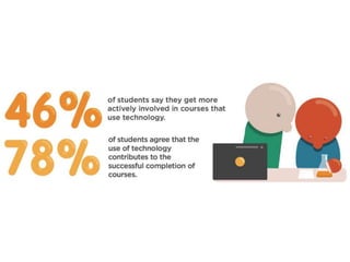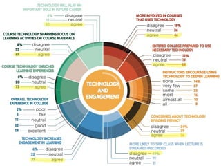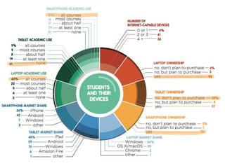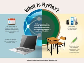 The document discusses current trends in educational technology, focusing on student perspectives and innovative learning models such as flipped classrooms, hyflex courses, and microlearning. It highlights key findings from a survey indicating that students value technology in their learning environments and prefer blended teaching approaches. Additionally, it explores future innovations like competency-based hiring and digital badges to enhance personalized learning experiences.