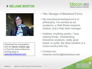 This document summarizes a presentation on current trends in fraud prevention. It discusses common types of payment fraud like check, credit card, and wire transfer fraud. It also discusses challenges posed by holder in due course claims for check fraud. The presentation recommends implementing a fraud prevention matrix that combines procedural controls, check protection, transaction screening, and fraud protection services. It provides examples of specific fraud prevention tools and services offered by banks and third parties.
