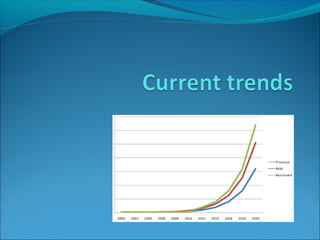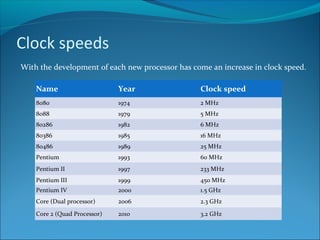 Processor clock speeds have steadily increased over time from 2MHz in 1974 to 3.2GHz in 2010. To further increase processing power, chip designers have added multiple processors to single chips, with dual core by 2006 and quad core by 2010. Memory capacity has also grown exponentially, doubling every 1.6 years so that by 2010 capacities reached 4096Mb (4Gb). Storage capacities have similarly expanded, from hard disks starting at 5Mb in 1954 to reaching terabytes by 2010, while floppy disks were replaced by USB drives with up to 128Gb capacity.
