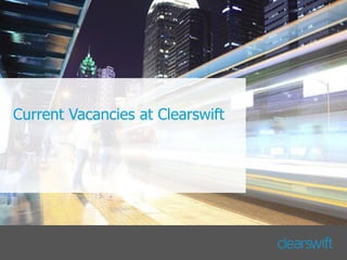Clearswift has several engineering and technical support vacancies. Positions include: a Software Engineer for email gateways; a Team Leader to manage software engineers; several senior software engineering roles; and technical support roles to provide customer support. Requirements include experience developing software, managing teams, technical skills like Linux, Java, and scripting, and customer service skills.