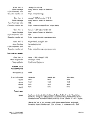 This curriculum vitae summarizes the professional experience and qualifications of Robin Willem Rudolf Zwart. He has over 20 years of experience as a chemical engineer working on biomass energy conversion projects at the Energy Research Centre of the Netherlands (ECN). His areas of expertise include biomass pretreatment, gasification, tar removal, and production of substitute natural gas (SNG) from biomass. He has published several books, articles, and reports on these topics.