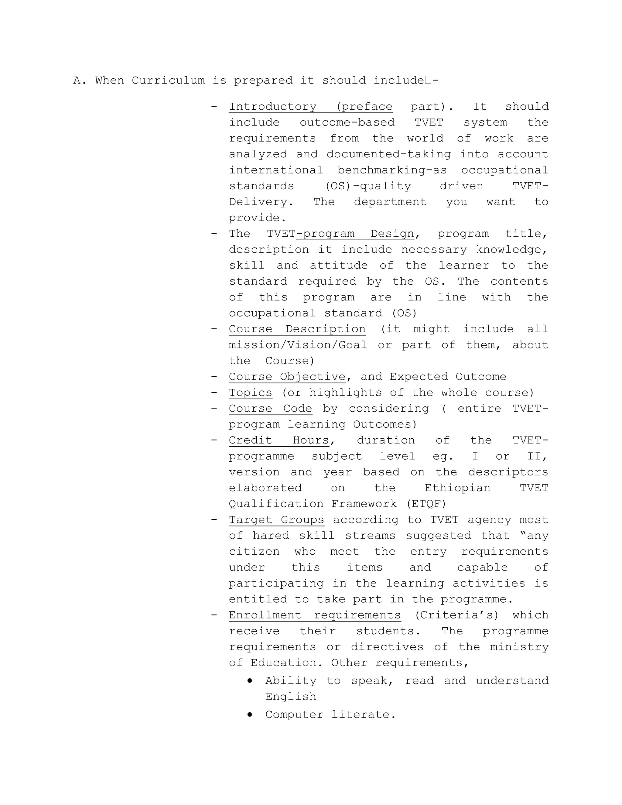 The document outlines the key components that should be included when preparing a TVET (technical and vocational education and training) curriculum. It states that a curriculum should include: an introductory preface describing the outcome-based TVET system and occupational standards; the program design and description aligned with occupational standards; course descriptions, objectives and outcomes; topics; code; credits and duration; target groups and enrollment requirements; modes of delivery including cooperative training; session plans; program structure; assessments of learning outcomes; trainer profiles; and resource requirements. The goal is to design a curriculum that develops the necessary skills, knowledge and attitudes to meet workplace standards through practical and theoretical learning assessments.