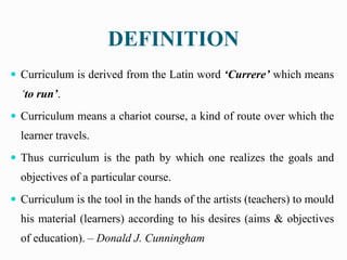 The document defines curriculum and discusses its key components and principles of development. It provides several definitions of curriculum, noting it means the totality of a learner's experiences and planned learning outcomes. The bases of curriculum include aims of education, philosophy of education, sociological and psychological factors. Key principles for developing curriculum are that it should meet learner needs, be useful, varied yet uniform, centered on learners and community, integrated, flexible, balanced, and develop readiness and creativity. The curriculum development process involves analyzing needs, designing content and experiences, implementing, and evaluating. Different approaches to organizing curriculum are also outlined.