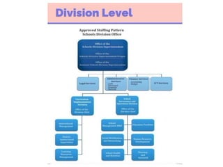 The document discusses curriculum implementation from the national to local levels, identifying curriculum workers like teachers and principals and their functions at each level. It outlines the 5 levels of implementation in basic education - national, regional, division, district, and school - and the roles at each, and the 3 levels in higher education - Commission on Higher Education, regional offices, and institutions. It also lists factors to consider for effective curriculum implementation like government requirements, learning environment, and societal and student needs.