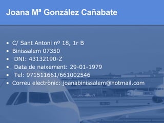 Joana Mª GonzálezCañabate C/ Sant Antoni nº 18, 1r B Binissalem 07350 DNI: 43132190-Z Data de naixement: 29-01-1979 Tel: 971511661/661002546 Correu electrònic: joanabinissalem@hotmail.com
