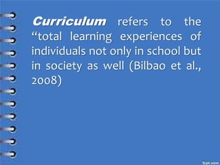 This document summarizes key aspects of curriculum development in the Philippines' K to 12 education system. It outlines that curriculum refers to all learning experiences, both in and out of school. It then describes features of curriculum like knowledge, skills, community partnerships, and performance strategies.