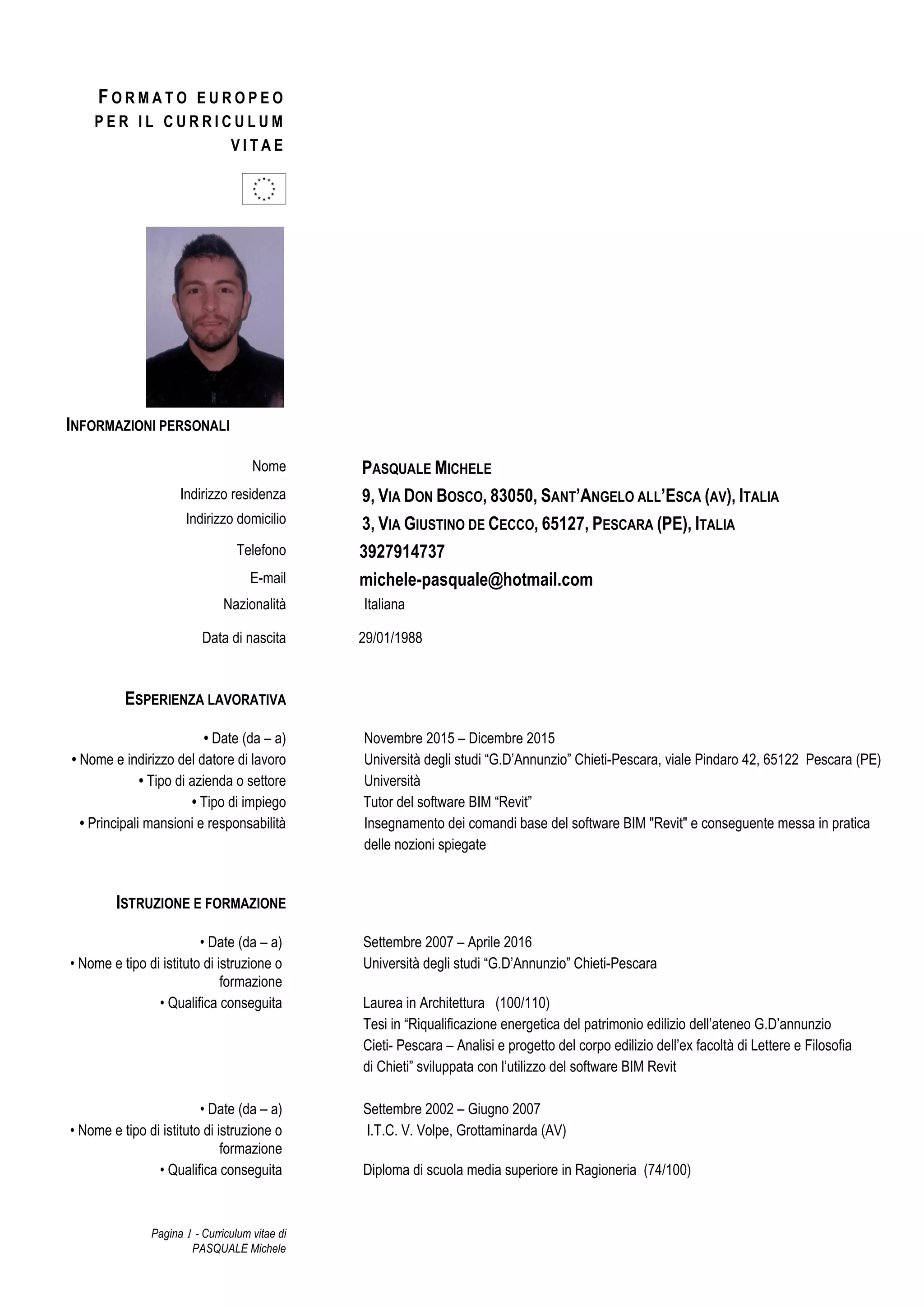 Pasquale Michele, nato il 29/01/1988, è un architetto con esperienza in studi di architettura e competenze in software come Revit e AutoCAD. Ha conseguito una laurea in architettura presso l'Università 'G. D'Annunzio' e ha svolto tirocini che includono progettazione d'interni e pratiche urbanistiche. È disponibile a lavorare sia in Italia che all'estero e ha buone capacità relazionali e organizzative.
