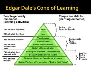 The document discusses curriculum and instructional design. It provides definitions of curriculum, including macro and micro curriculum. It also discusses objectives and characteristics of different curriculum models used in the Philippines like the Secondary Education Development Plan curriculum, New Secondary Education Curriculum, Basic Education Curriculum, and Revised Basic Education Curriculum. Instructional design models and theories are also covered, including Gagné's nine events of instruction and the ADDIE model of analyze, design, develop, implement, and evaluate. Learning domains and outcomes based on behaviorism, cognitivism, and constructivism are summarized as well.