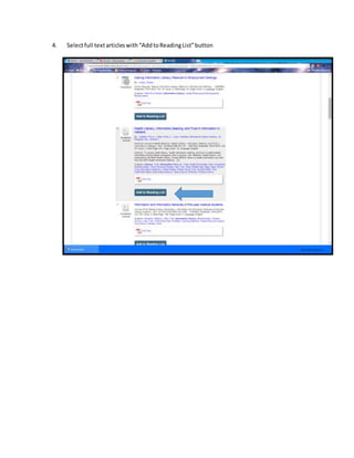 Install the CurriculumBuilder widget and open it in Edit Course mode to access library resources and add full text articles to a reading list by selecting the "Add to Reading List" button. The reading list can then be reordered, added to with notes, folders or web resources by selecting "See Current Reading List". Students will see the reading list in their D2L Student View.