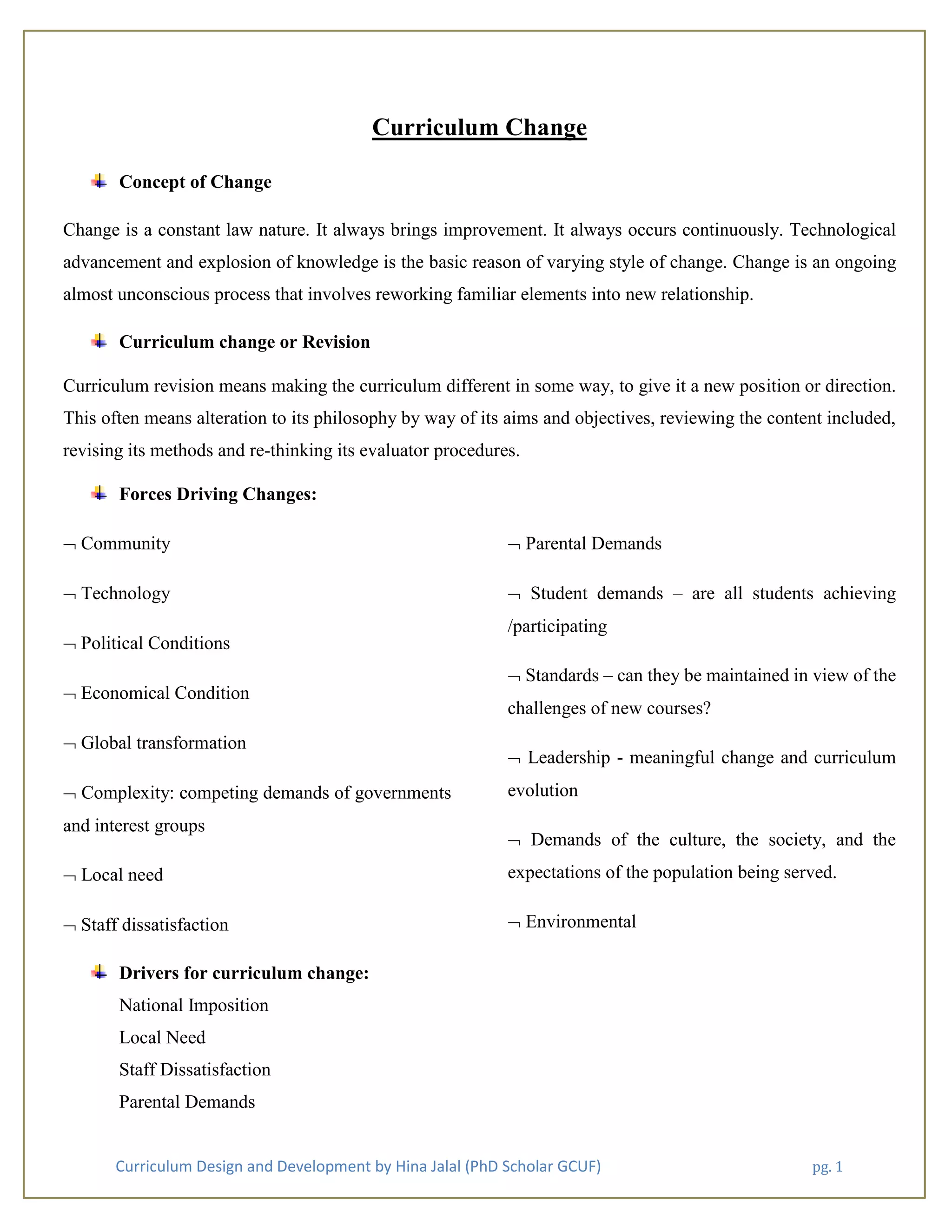 The document discusses the concept and necessity of curriculum change, emphasizing that it is an ongoing process driven by various factors such as community needs, technology, and political conditions. It outlines the types of curriculum changes, the process involved, and the challenges faced, including political, societal, and economic issues. Additionally, it highlights the importance of aligning curriculum with modern educational demands and societal expectations.
