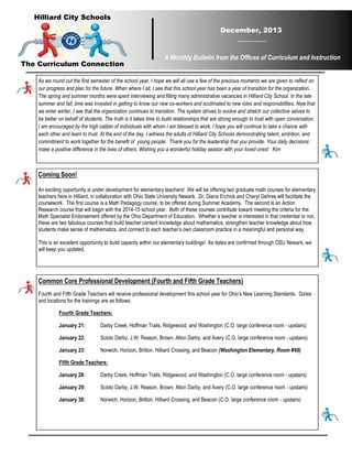 Hilliard City Schools provides professional development for teachers on Ohio's new learning standards. Trainings will be held in January for 4th and 5th grade teachers. The district also offers graduate math courses for elementary teachers in collaboration with Ohio State University Newark. Registration information is being prepared for distribution to middle and high schools in January and February for the 2014-2015 school year. The district conducted a parent survey about math education and aims to improve communication with parents regarding teaching philosophies and resources to support learning at home.