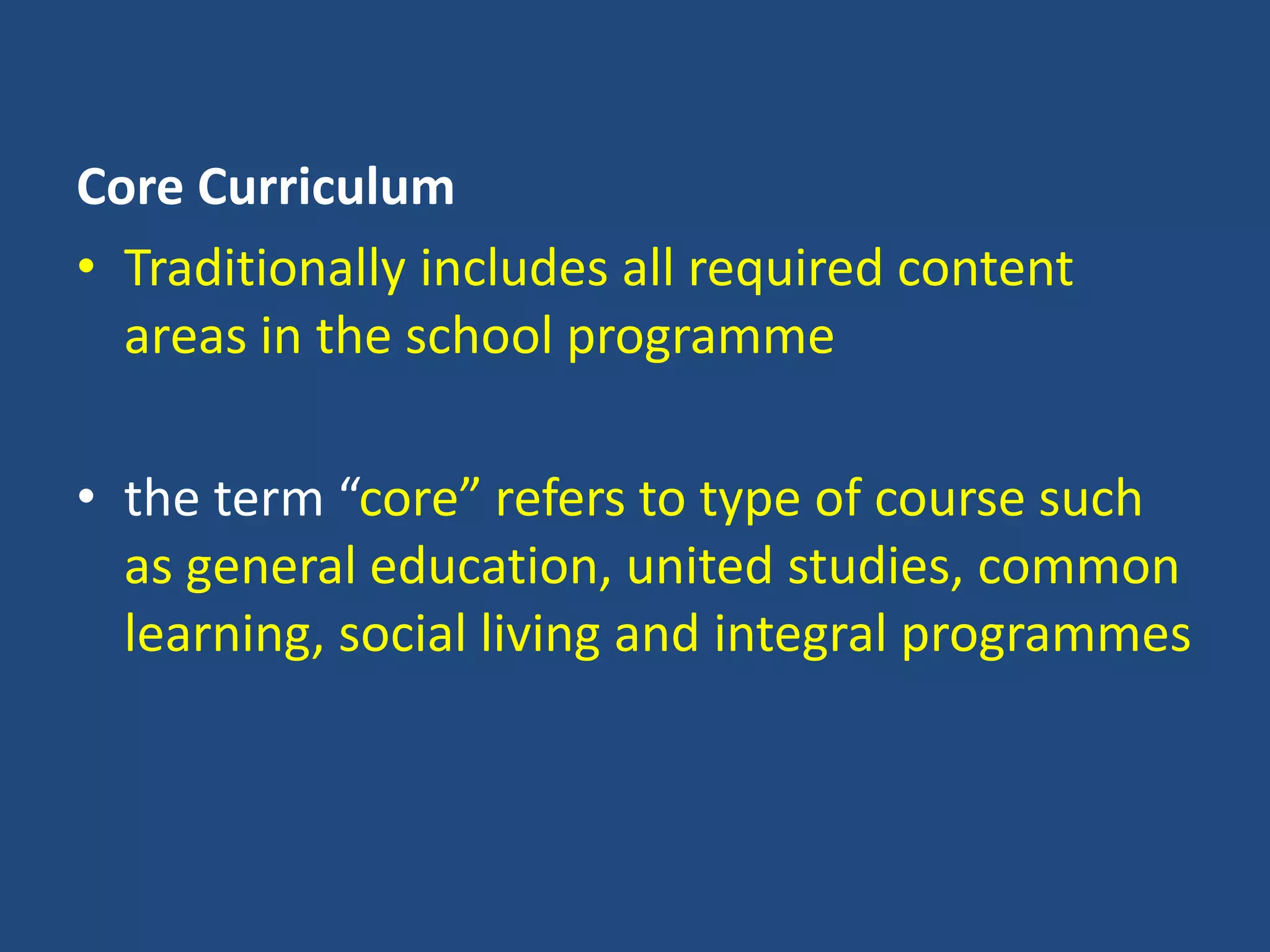 The document discusses three types of curriculum: core, hidden, and null. The core curriculum includes required content areas and experiences needed by all students. The hidden curriculum refers to unintentionally taught behaviors, attitudes, and perspectives. The null curriculum consists of information not taught in schools and represents excluded topics, facts, or perspectives. Both the hidden and null curriculums can influence students' social development and perspectives.