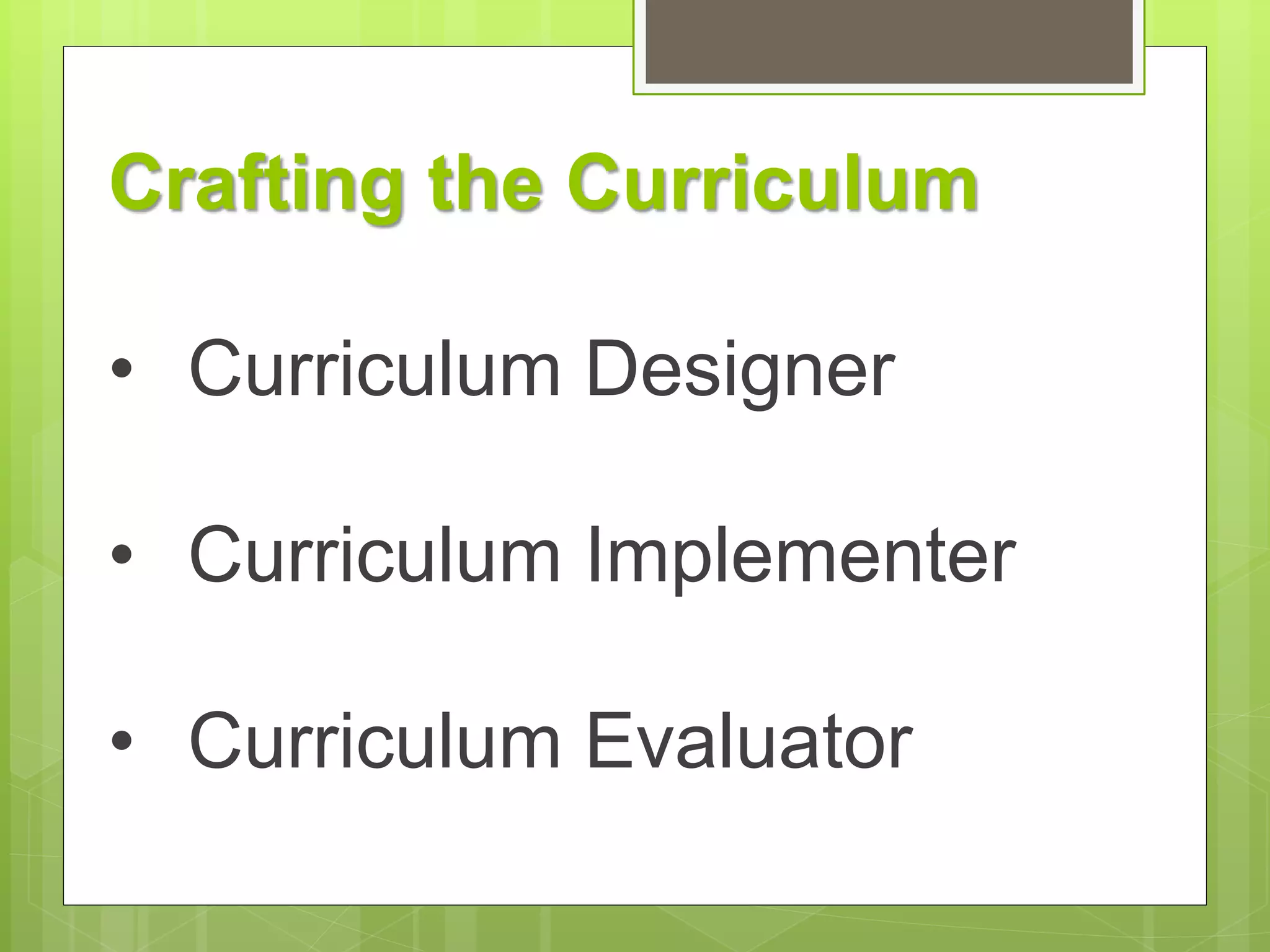 The document discusses various models of curriculum design, highlighting the distinction between horizontal and vertical organization of curriculum elements. It categorizes curriculum design into subject-centered, learner-centered, and problem-centered models, explaining each type's focus and application. The importance of integrating subjects and adapting to learner needs is emphasized throughout the text.