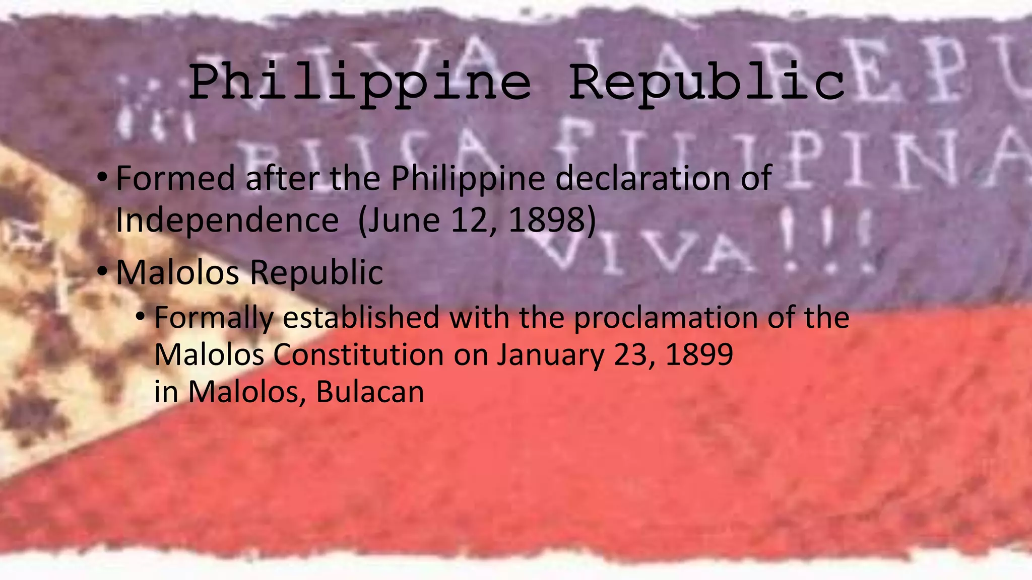 The Philippine Republic was formed in 1898 after the country declared independence from Spain. The Malolos Republic was then formally established in 1899 with the proclamation of the Malolos Constitution. During this time, the curriculum in the Philippines underwent various experiments and revisions. These included using the vernacular as the medium of instruction, increasing the use of Philippine-oriented instructional materials, and introducing vocational education and citizenship training programs.