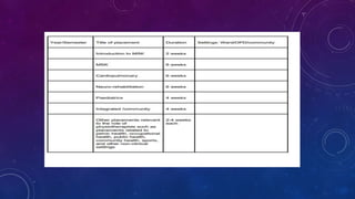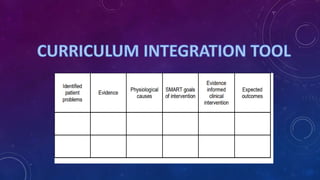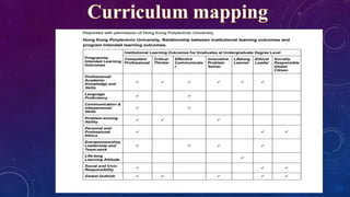 This document discusses curriculum development for a physiotherapy program. It begins by defining curriculum and describing different levels and models of curriculum. It then discusses aligning the curriculum with the program's vision and selecting teaching strategies. The document also contrasts traditional vs modern approaches and references key curriculum theorists like Tyler, Wheeler, Kerr, and Taba. It describes curriculum mapping and outlines components of a course syllabus. Finally, it discusses integrating content, clinical reasoning, and skills across the curriculum.