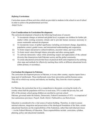 The document outlines the curriculum development process in Pakistan, highlighting key considerations such as national and global relevance, cultural preservation, and practical skills training. It details the structured framework involving central and provincial bodies tasked with curriculum and textbook development, as well as the implementation strategy. Challenges such as political interference, economic constraints, and teacher training gaps are identified as significant obstacles to effective curriculum reform.