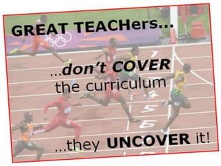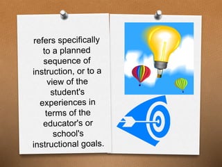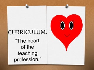 This document discusses curriculum in schools. It defines curriculum as the lessons and academic content taught in a school. It outlines the different levels of education (elementary, high school, technical/vocational, higher) and the types of curricula (recommended, written, taught, supported, assessed, learned, hidden). It emphasizes that the teacher plays a key role as a curricularist - knowing the curriculum, writing it, planning it, initiating new curriculum, innovating it, implementing it, and evaluating it. The teacher's influence on students and the curriculum extends far beyond the classroom.
