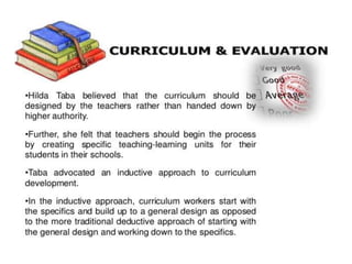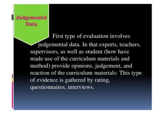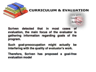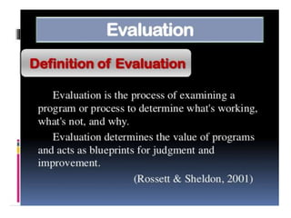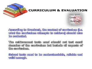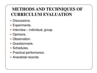 This document discusses evaluation of curriculum and the teaching-learning process. It defines evaluation as the systematic process of determining if changes in student behavior are occurring as intended. Evaluation is an ongoing, continuous process that assesses programs, individuals and institutions, and helps make decisions about students, teaching methods, and objectives. It includes both measurement of outputs and qualitative considerations to suggest improvements. The document also discusses the meaning and need for curriculum evaluation, its various methods and techniques, levels of formative and summative evaluation, factors that influence curriculum changes, and outlines a curriculum evaluation plan.