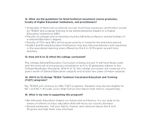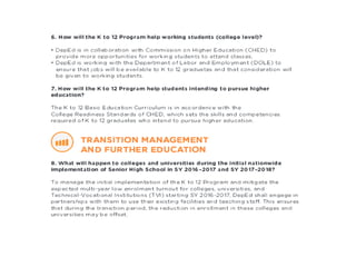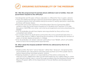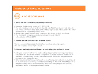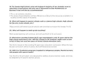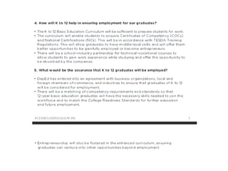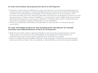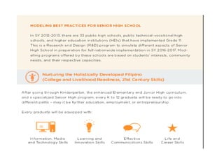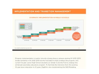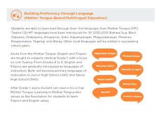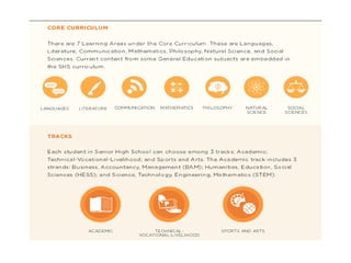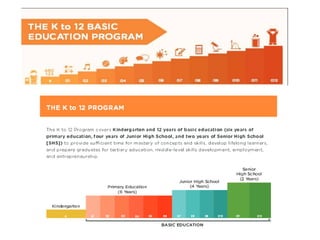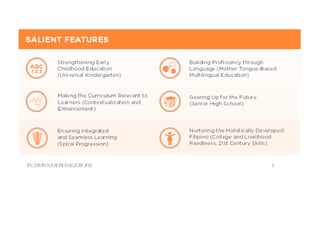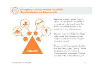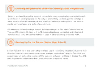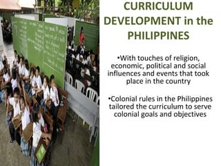 The document discusses the history and evolution of the curriculum in the Philippines, highlighting the influences of colonial powers and the importance of a structured framework for education that meets both societal and learner needs. It reviews various curriculum phases from pre-Spanish to the present, including significant reforms such as the K to 12 program, which emphasizes multilingual education and prepares students for multiple career paths. Additionally, it addresses the shift towards incorporating local culture and community needs into the educational system.