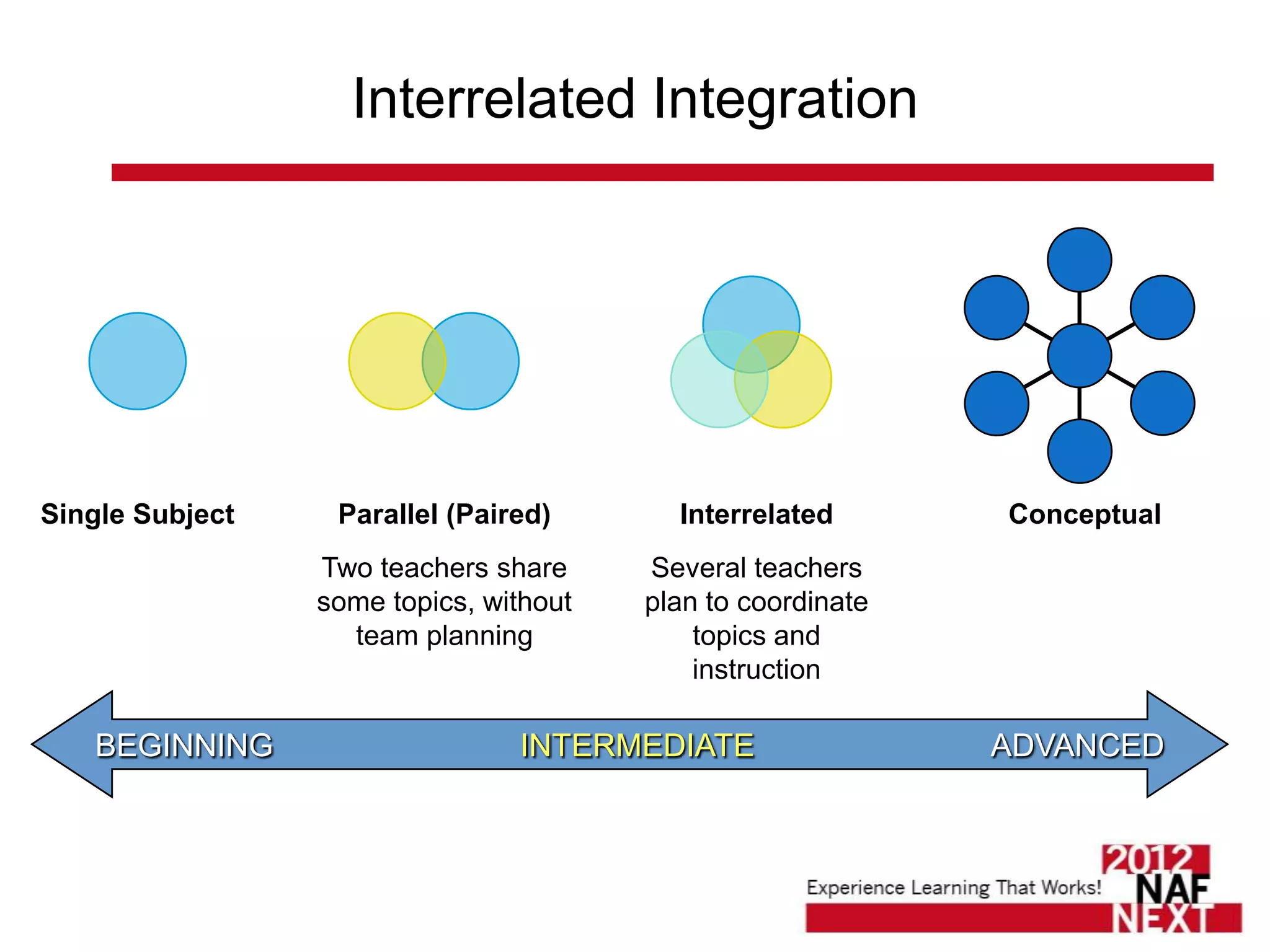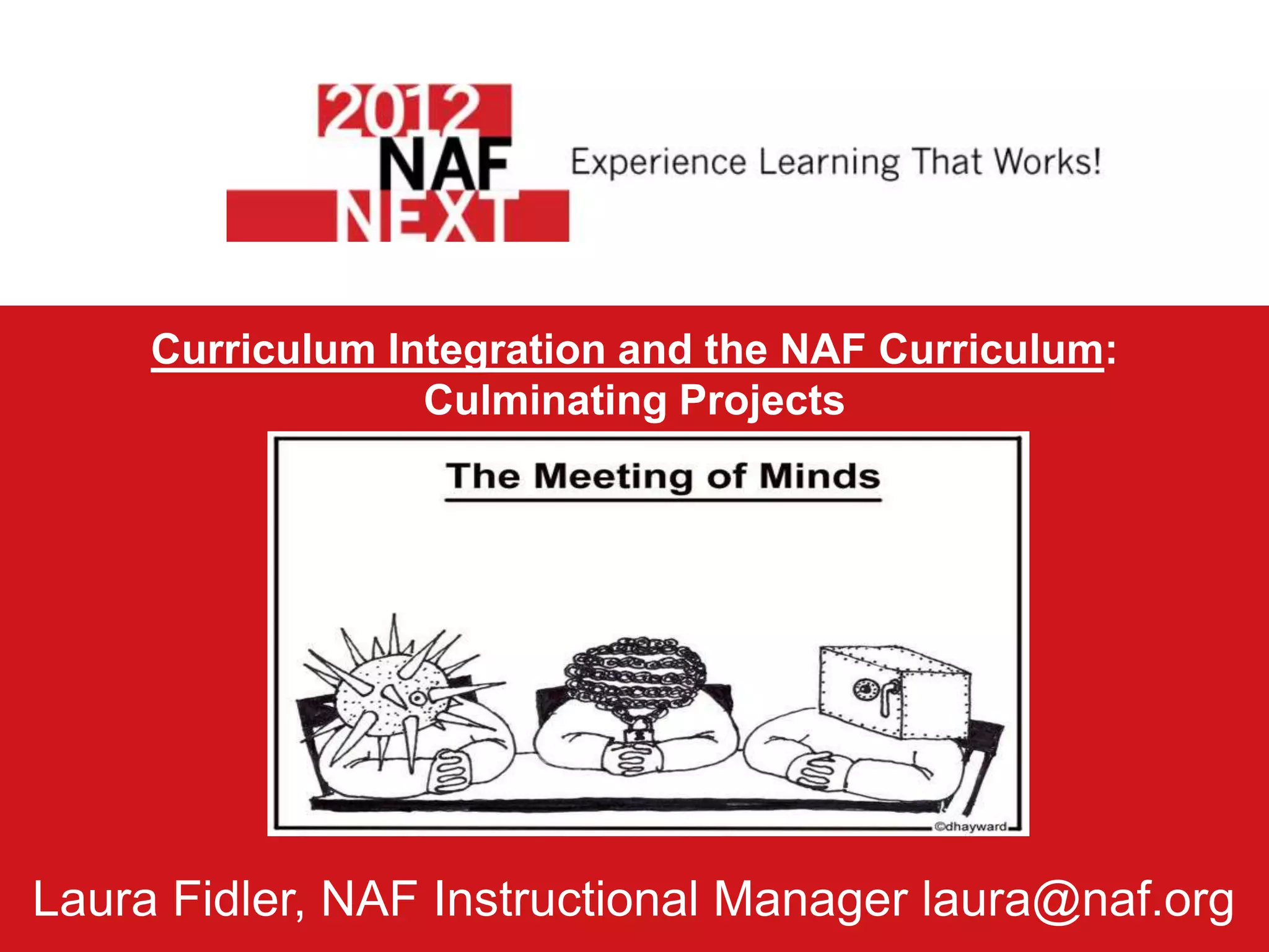 The document outlines the integration of the NAF curriculum with a focus on culminating projects, which encourage collaboration across various academic disciplines. It details curriculum structure, the importance of technology and differentiated instruction, and provides correlations to Common Core standards. Additionally, it includes guidelines for assessment and project rubrics that outline expectations for student presentations and understanding of content.