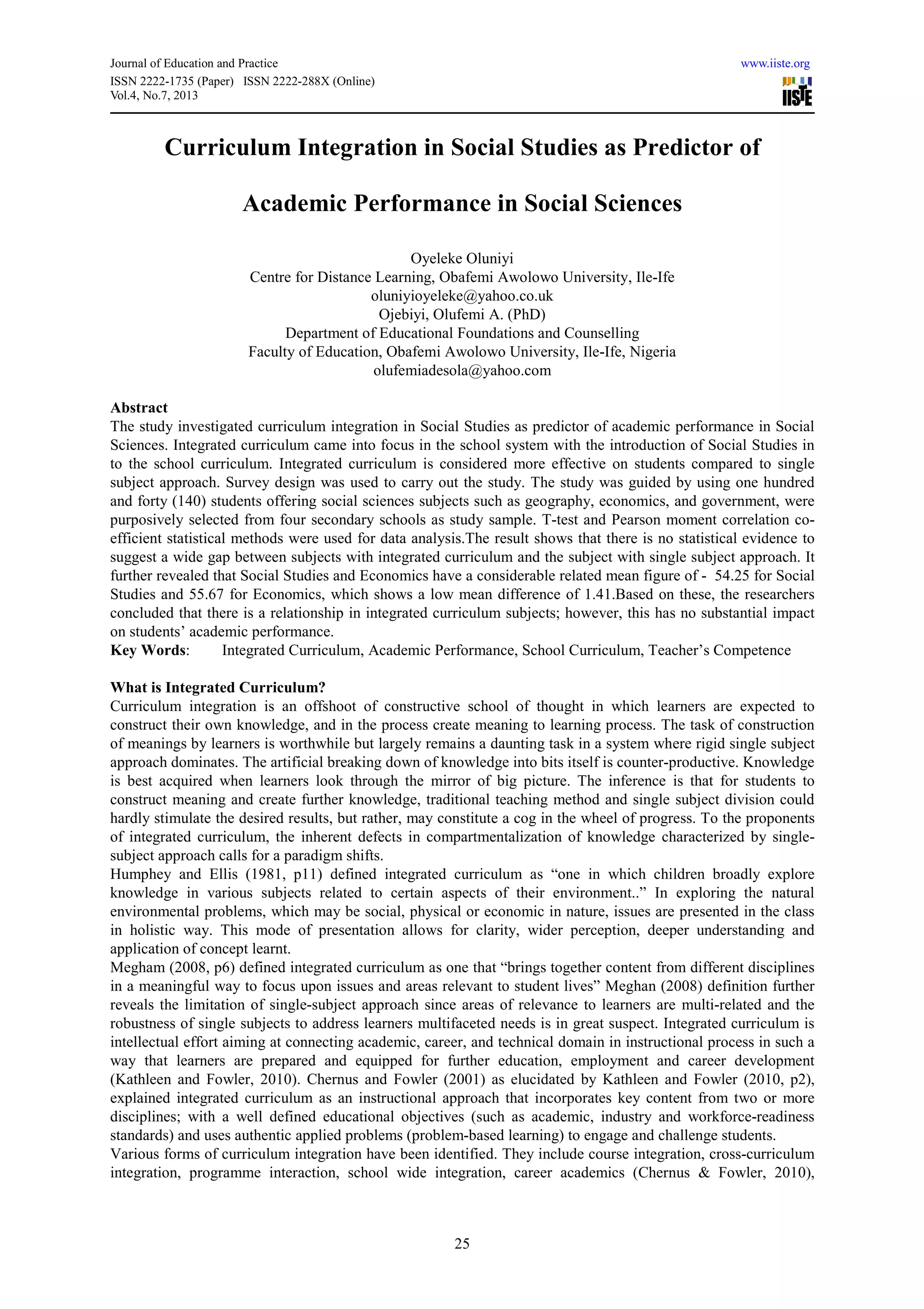 1) The document examines the relationship between curriculum integration in Social Studies and academic performance in Social Sciences.
