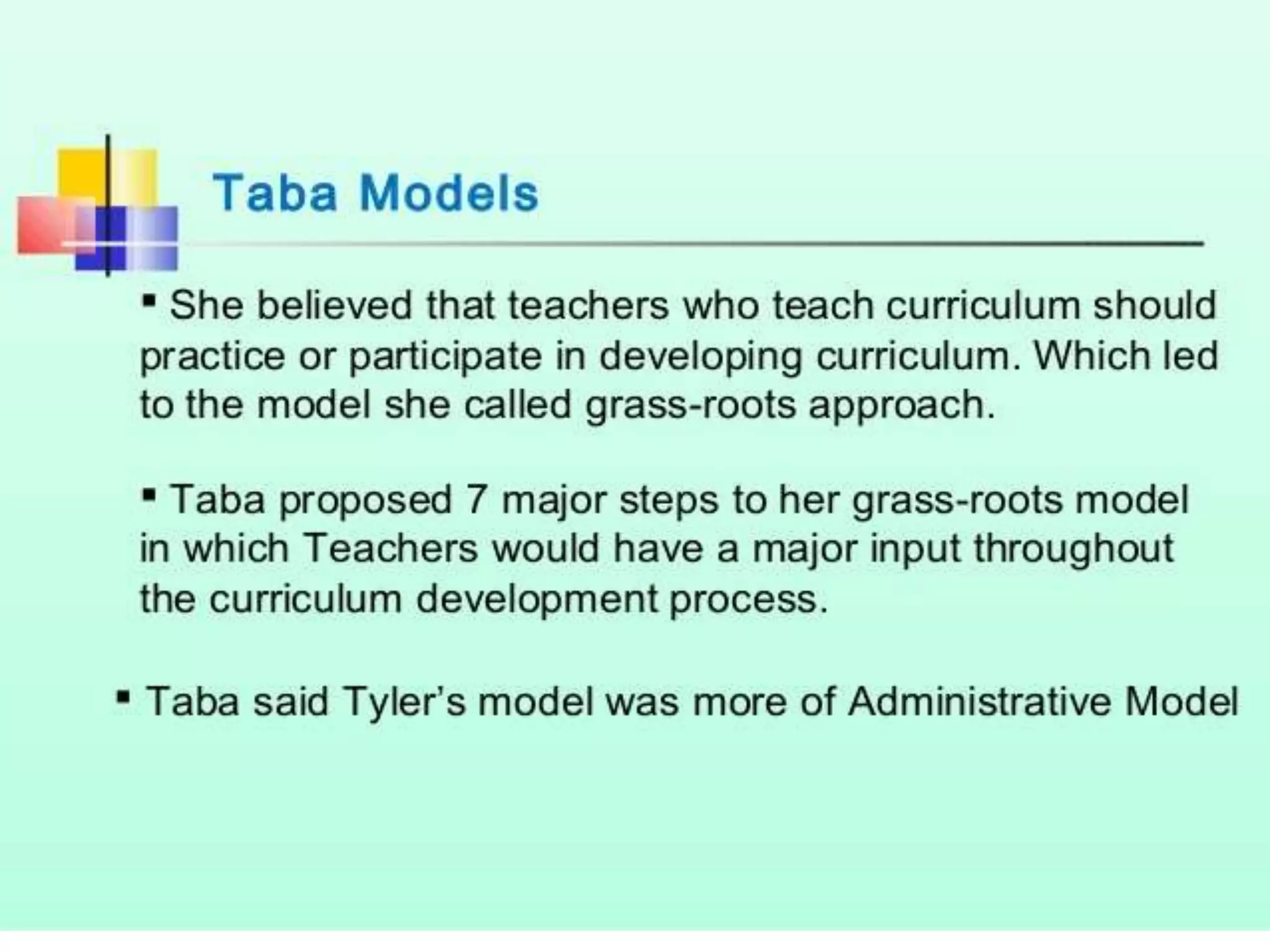 Taba Model emphasizes inductive reasoning, involving students in data collection and critical thinking.Steps for curriculum design: diagnosing needs, formulating objectives, content selection, and organization.Importance of evaluation in curriculum development and monitoring learning outcomes through standards.