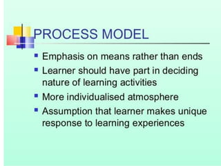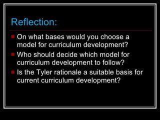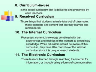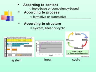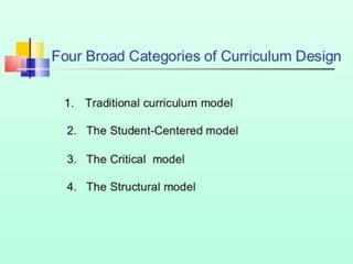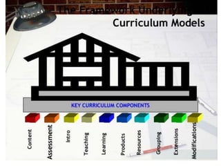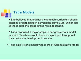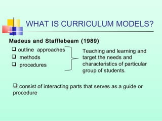 The document outlines various curriculum models and frameworks used in education, emphasizing the importance of structured teaching planning. It details different models such as the Taba, Tyler, and Saylor/Alexander methods, highlighting their respective focuses on inductive and deductive approaches to curriculum development. Furthermore, it discusses the significance of curriculum frameworks in setting educational standards and organizing content effectively.