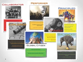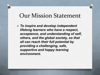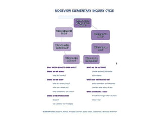 Ridgeview's mission is to develop lifelong learners who respect themselves and others through a challenging and supportive learning environment. Goal 1 is to improve student learning through an inquiry-based approach. Students will develop inquiry skills to deepen understanding of topics. Inquiry engages students by having them solve real-life problems. Goal 2 is to increase student awareness of student profiles to improve achievement and focus on learning.
