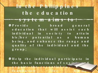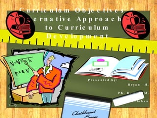 The document discusses curriculum objectives and alternative approaches to curriculum development in the Philippines. It provides an overview of the structure and goals of the Philippine education system from pre-school to tertiary education. It also outlines current priorities in improving education quality, access, and linking education to employment. Finally, it presents several alternative approaches to curriculum development, including technical, behavioral, intellectual, and humanistic models, as well as eclectic combinations of approaches.
