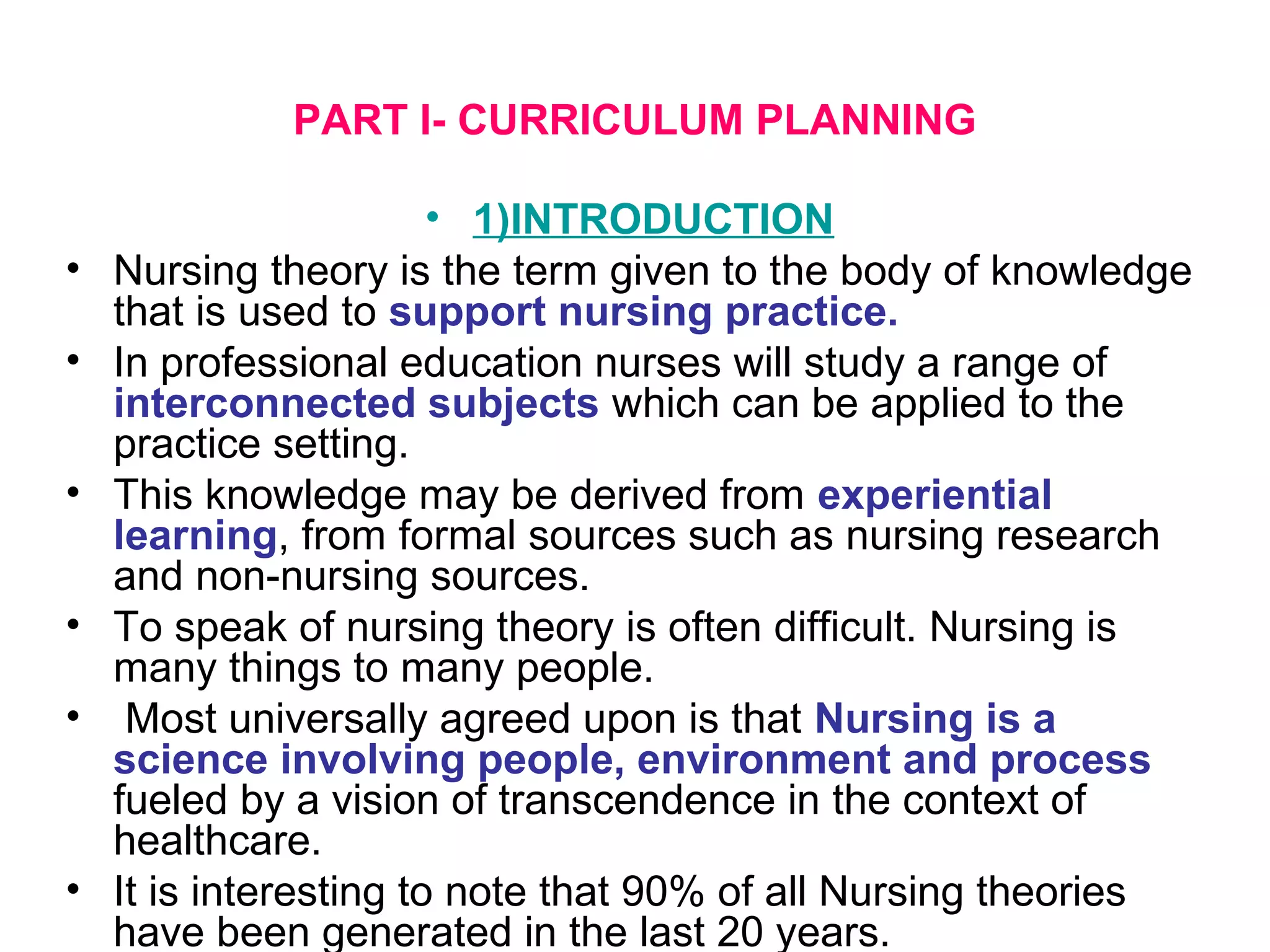 This document discusses curriculum planning and implementation based on nursing theories. It outlines several parts: the need for theory-based curriculum due to lack of confidence in theories among nurses; using theories with confidence in all aspects of nursing education; and basing curriculum on five principles including theory-based reasoning. It then provides several examples of how to incorporate specific nursing theories into curriculum planning and implementation, such as Orem's Self-Care Theory and Maslow's Motivation Theory. Student learning and evaluation are also discussed. The conclusion states that a theory-based education provides a framework for nursing care but requires openness to new approaches.