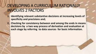 Curriculum planning involves identifying substantive decisions at increasing levels of specificity and checking for consistency between goals and methods. There are two major issues in curriculum planning: who plans it and how. Effective curriculum planning considers factors like the educational profession, testing data, student needs, culture, society, and teachers. The change process in curriculum development involves understanding change, analyzing factors, managing resistance, and following strategic steps and sequences for initiating and implementing changes.
