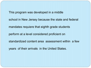 This document describes a program called "Students as Teachers" developed at a middle school in New Jersey to help English Language Learners succeed in science. The program is based on the ideas that students learn best in groups and when they can leverage their strengths. It has students of varying English proficiency levels work collaboratively in groups to summarize, illustrate, and teach each other content from science chapters. The teacher introduces topics and monitors the process, while students assume responsibilities within their roles. Evaluation found the program improved students' science grades by a letter on average and reduced disciplinary issues, as students focused more deeply on language proficiency when explaining concepts to peers. The conclusion is that allowing collaborative work and student-created materials can help many English