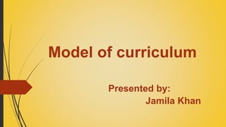 The document outlines a model for curriculum development that includes 7 steps: 1) Diagnosing needs, 2) Formulating objectives, 3) Selecting content, 4) Selecting learning experiences, 5) Selecting teaching methods, 6) Implementation, and 7) Evaluation. It describes each step in the process, highlighting that the selection of content considers student characteristics and objectives, and criteria for content include relevance to life, variety, and learnability. The model emphasizes that learning experiences refer to learner interactions with their environment and that evaluation depends on the curriculum content.