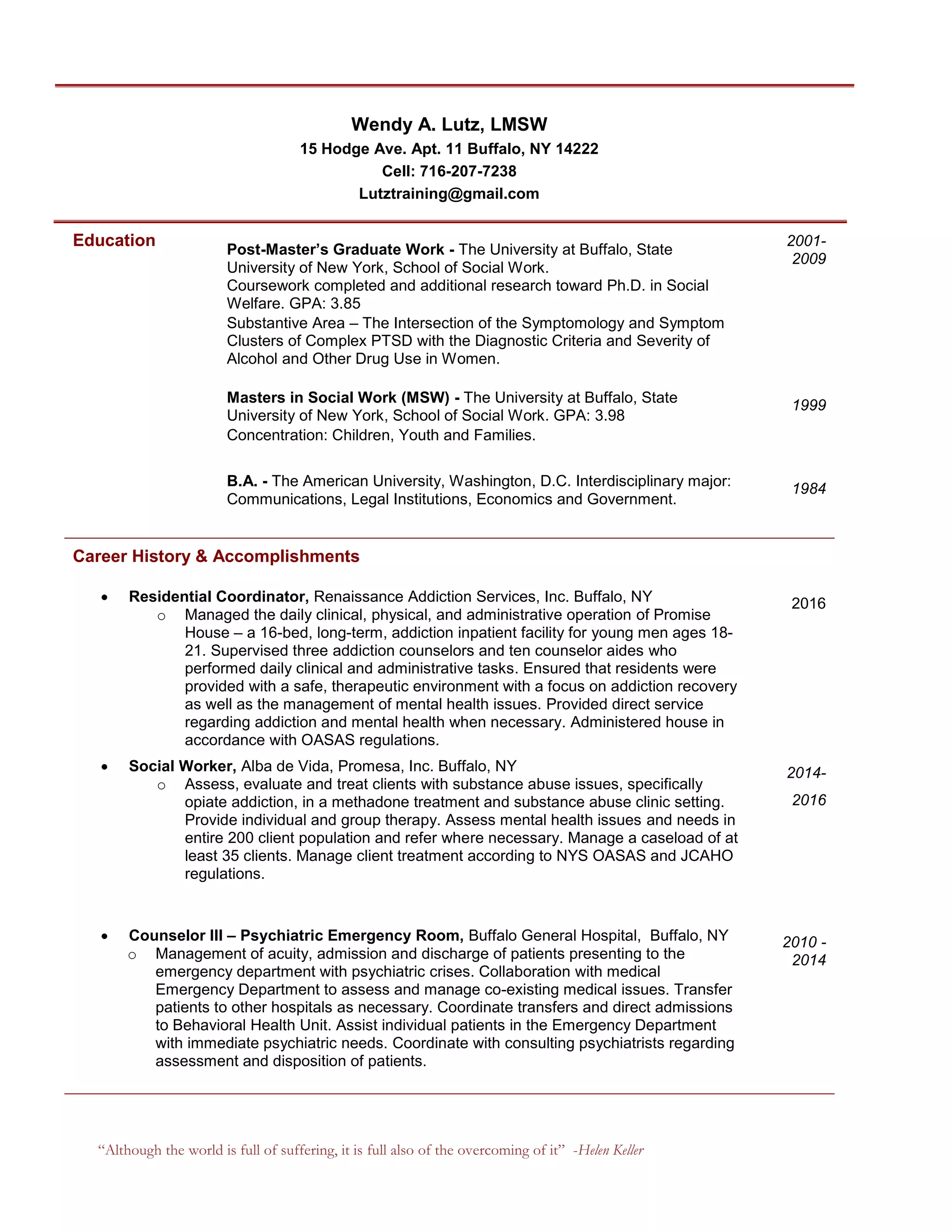 Wendy A. Lutz is an experienced social worker with a strong educational background, holding a master's degree in social work and post-master’s graduate work towards a Ph.D. in social welfare. Her career includes management positions in addiction services, psychiatric emergency care, and program quality improvement, focusing on trauma, substance abuse, and mental health. Lutz has published research on trauma and addiction and has been actively involved in various professional organizations and training programs within the social work community.