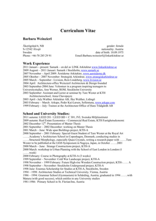 Barbara Weinzierl is an Austrian architect currently working at Samark in Stockholm, Sweden. She has over 15 years of experience working in architecture firms in Sweden and Denmark. She received her Master's degree in architecture from the Technical University of Vienna in 2002. Her skills include ArchiCAD, Revit, Adobe InDesign, and she is fluent in English, Swedish and German.