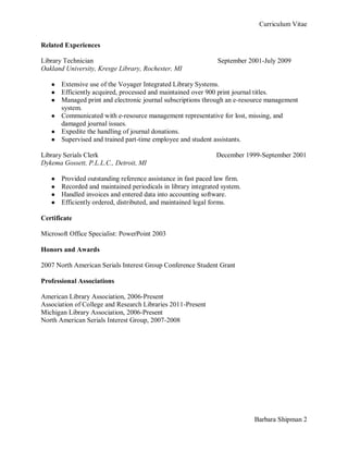 Barbara Shipman is seeking the position of eLearning and Instructional Technology Librarian at Oakland University's Kresge Library. She has a Master's degree in Library and Information Science from Wayne State University and over 10 years of experience working in academic libraries, including her current role as a part-time librarian and lecturer at Kresge Library. Her experience includes information literacy instruction, reference services, online tutorial creation, collection development, and management of print and electronic journal subscriptions. She is proficient in library systems and technologies such as Voyager, SubjectsPlus, and Captivate.