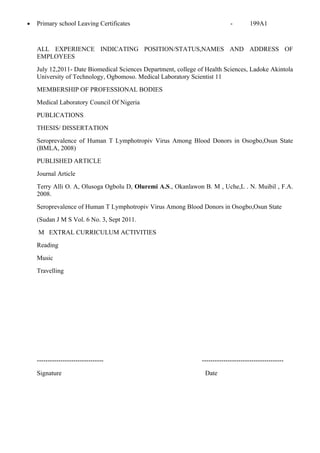 This document contains a job application from Oluremi Adeolu Sunday for a position in microbiology. It includes personal details, career objectives, educational background from primary school through university degree, work experience, publications, skills and interests. References are provided from three professionals who can recommend the applicant. The application demonstrates qualifications for the microbiology role through educational and professional experiences relevant to the field.