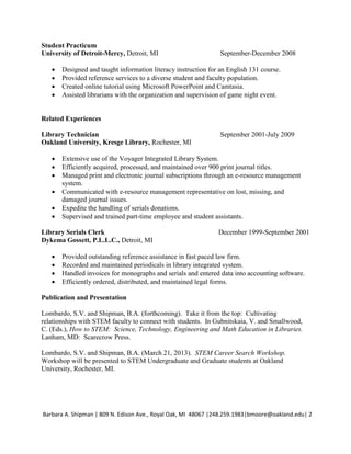 Barbara A. Shipman is a Special Lecturer at Oakland University where she teaches information literacy instruction and provides research services. She has an M.L.I.S. from Wayne State University and a B.A.A. in Broadcasting and Cinematic Arts from Central Michigan University. Prior to her current role, she worked as a Library Technician at Oakland University and a Library Serials Clerk at a law firm. She is published and has presented workshops on STEM career searching.