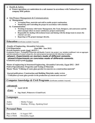 Ahmed Youssef Abo Shama has over 5 years of experience as a civil site engineer working on construction projects in Egypt. He received his Bachelor's degree in Civil Engineering from Alexandria University in 2012 and a Master's degree in Structural Engineering from the same university in 2015. His master's thesis focused on utilizing waste glass powder in concrete. He is proficient in AutoCAD, SAP, STAAD, Primavera, and Excel.