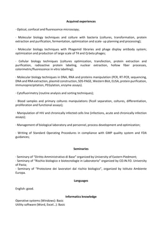 This document is a curriculum vitae for Ferretti Massimo that includes his personal details, education history, work experience, skills, publications, and other qualifications. It summarizes that he received a PhD in Molecular Medicine in 2008, has worked in development biology at Diasorin since 2010, has experience in molecular biology techniques, cell culture, and managing biological laboratories, and has authored 11 scientific publications.