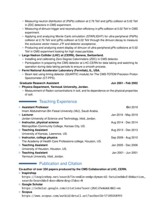 This document contains the resume of Ayman Al-bataineh. It summarizes that he has a PhD in Experimental Nuclear Physics from the University of Kansas and experience working on the CMS experiment at CERN, studying nuclear effects at high energies. He has worked as an Assistant Professor and published over 350 papers as part of the CMS Collaboration.