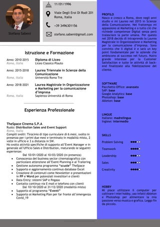 Stefano Sabeni, laureato in scienze della comunicazione e con una laurea magistrale in organizzazione e marketing, ha una forte passione per il digital marketing e la customer satisfaction. Ha esperienza nel settore cinematografico, dove ha svolto un tirocinio presso thespace cinema, occupandosi di supporto alla vendita e all'organizzazione di eventi. Possiede competenze in software di base e avanzata, oltre a interessi creativi nel campo della musica e della grafica.