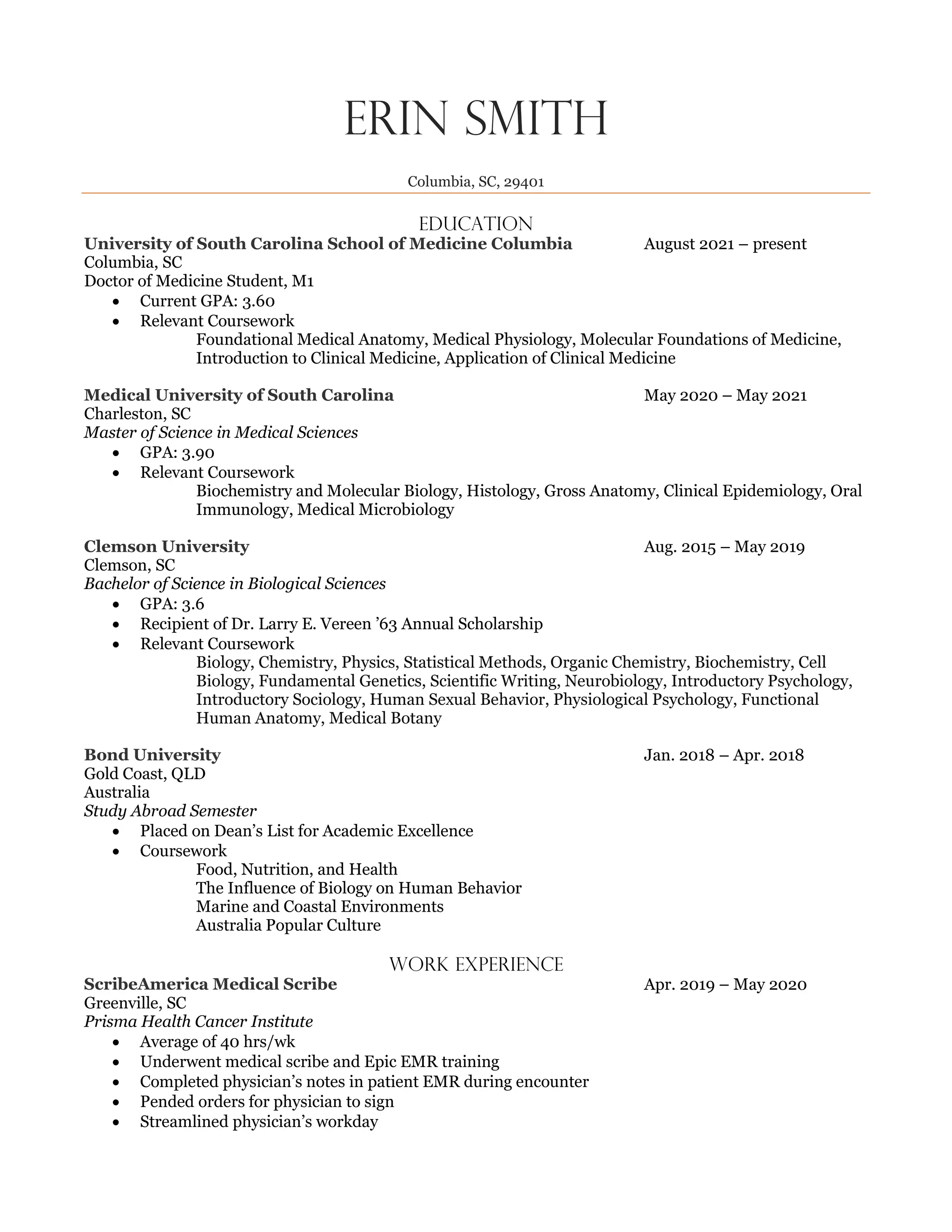 This document provides a summary of Erin Smith's education and qualifications. She is currently a first year medical student at the University of South Carolina School of Medicine Columbia, and has a Master's degree in Medical Sciences from the Medical University of South Carolina and a Bachelor's degree in Biological Sciences from Clemson University. Her relevant work and volunteer experience includes medical scribing, clinical shadowing, and leadership roles. She has also participated in research and published a conference presentation.
