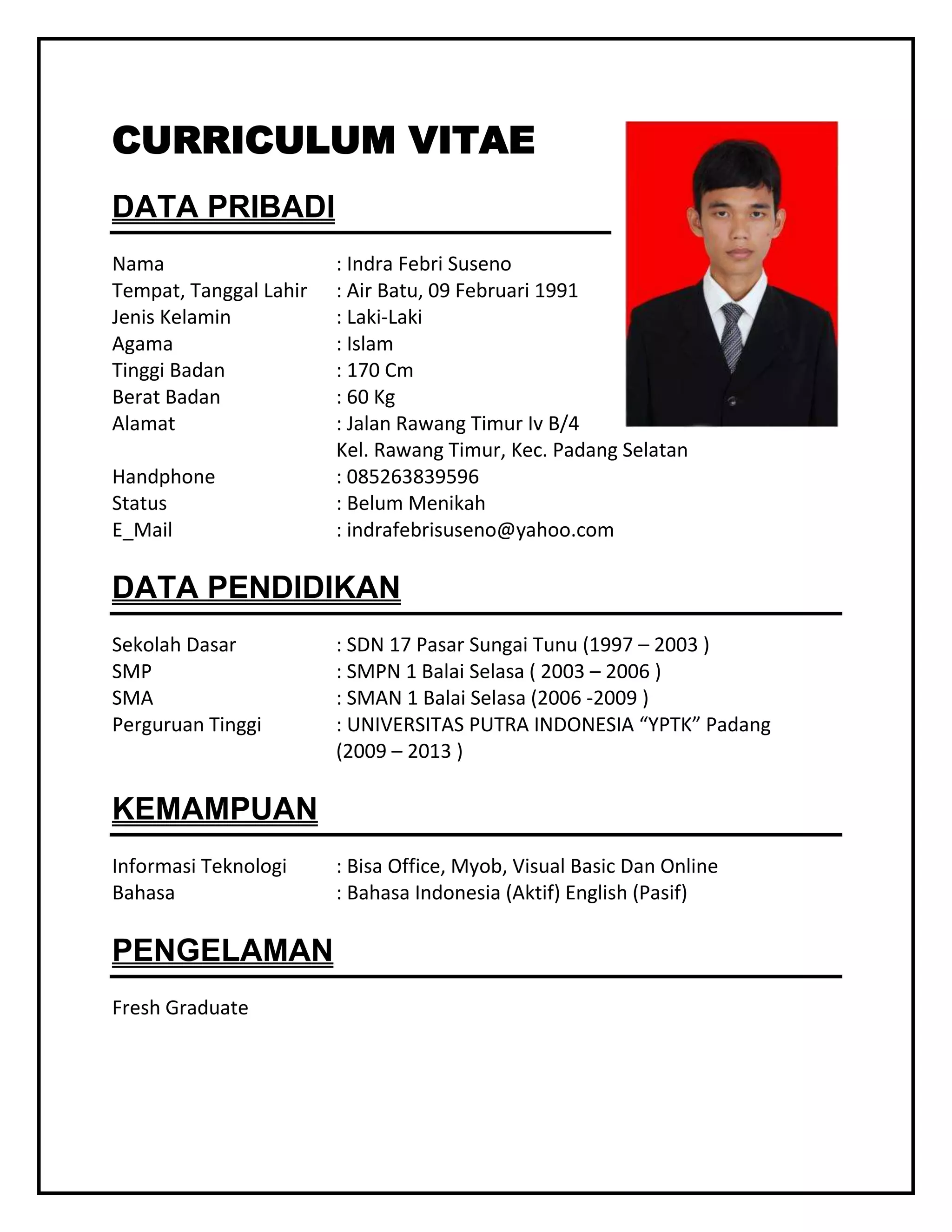 Dokumen ini adalah curriculum vitae Indra Febri Suseno, mencakup informasi pribadi seperti nama, tanggal lahir, jenis kelamin, agama, tinggi dan berat badan, alamat, dan status pernikahan. Riwayat pendidikan mencakup SD, SMP, SMA, dan perguruan tinggi, dengan gelar dari Universitas Putra Indonesia 'YPTK' Padang. Indra memiliki kemampuan dalam teknologi informasi, termasuk penggunaan Office, MYOB, dan Visual Basic, serta kemampuan berbahasa Indonesia secara aktif dan Inggris secara pasif.